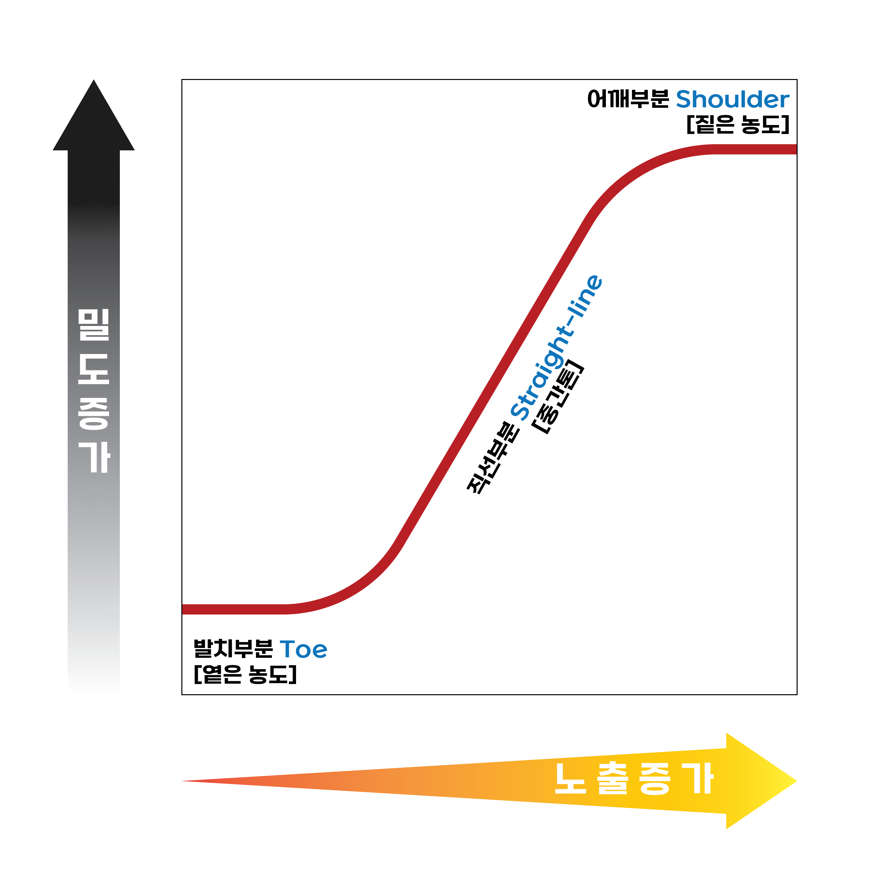 광량이 할로겐화 은을 반응시키기에 충분하지 않은 단계로 밀도가 거의 변하지 않으며 사진상에서는 암부(Shadow)의 디테일이 사라지고 단조로운 검은색으로 나타난다. 이를 `데이터가 쌓이지 않았다`고 표현한다. - 직선(Straight-line) 영역: 적정 노출(Normal exposure)