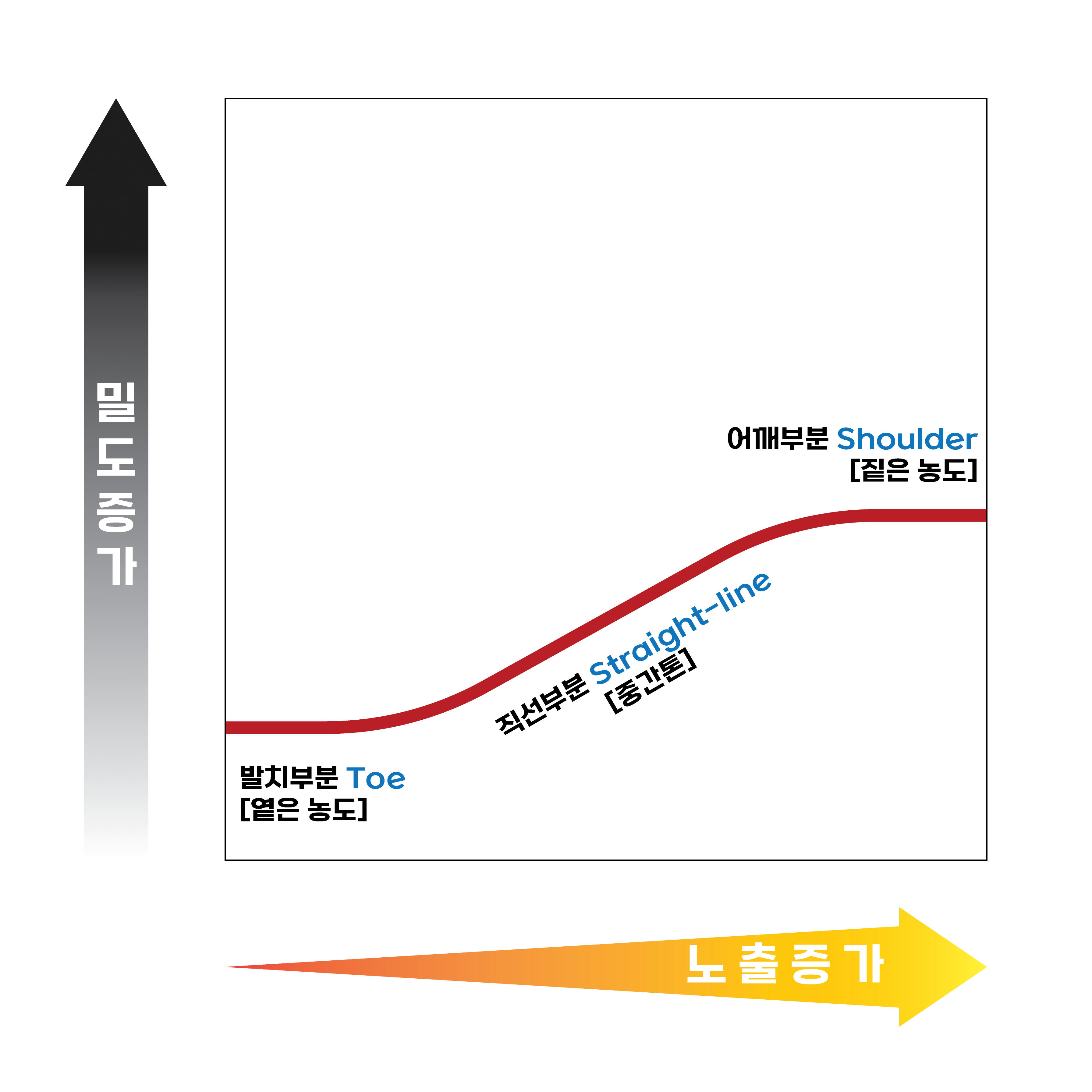 광량의 증가와 밀도의 증가가 일정한 비율(기울기)로 유지되는 구간이다. 피사체의 밝기 차이가 필름상의 밀도 차이로 정확하게 변환된다. 이 구간의 기울기를 감마(𝜸)라고 하며 이는 사진의 콘트라스트를 결정한다. - 숄더(Shoulder) 영역: 고노 출(Over-exposure)