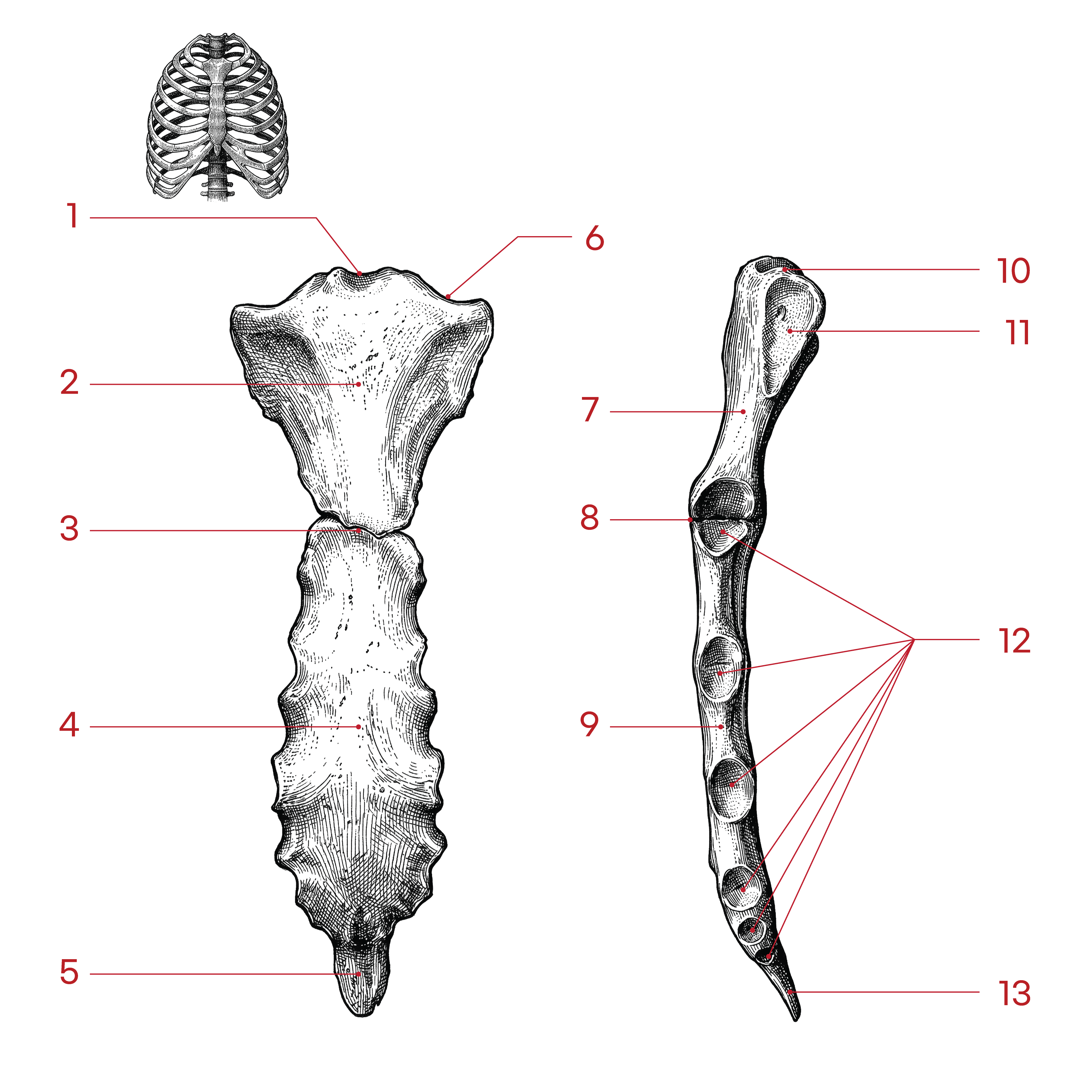 칼돌기 Xiphoid process 복장뼈 맨 아래쪽의 뾰족한 연골/뼈 돌기
