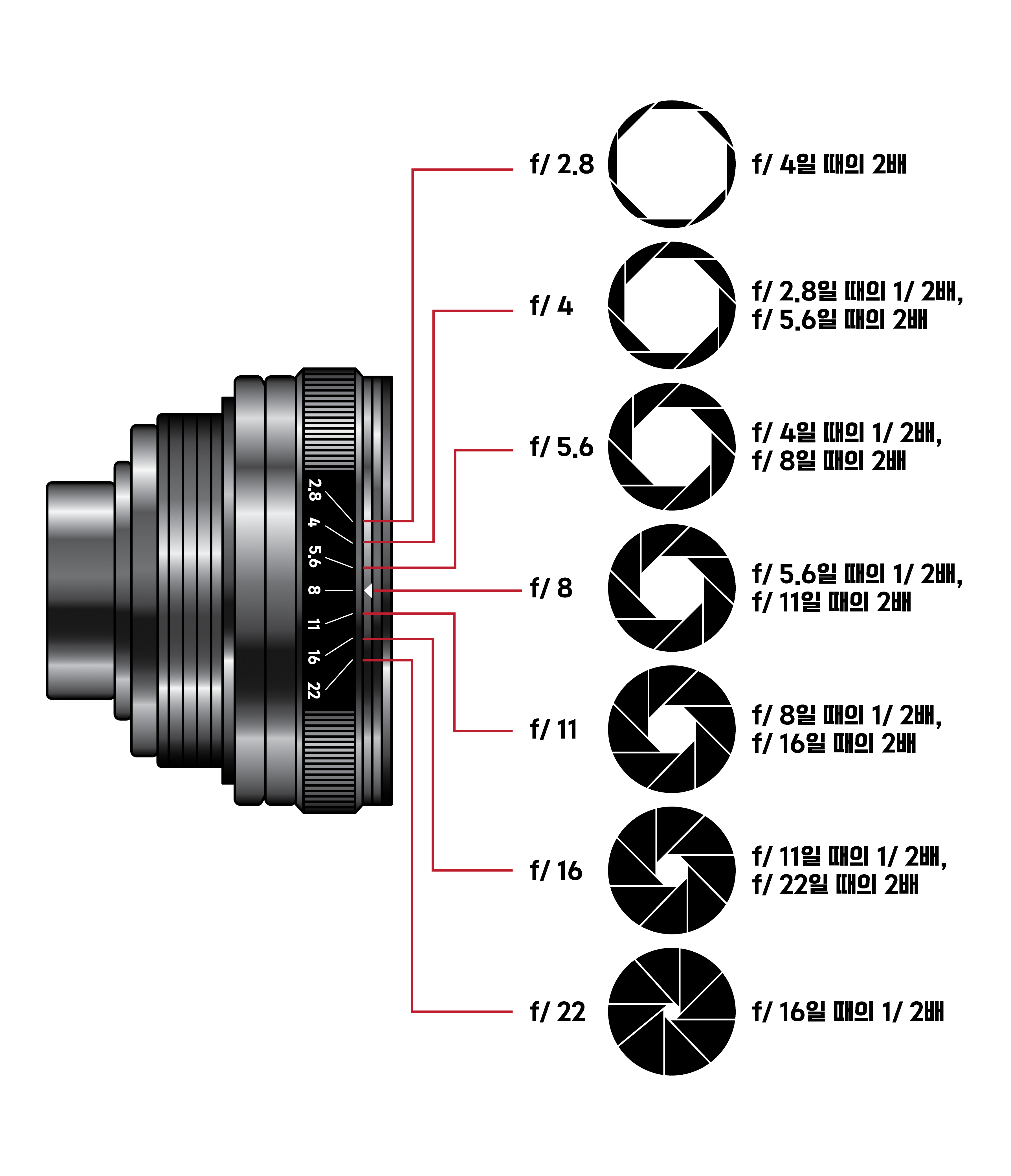 - f/1, f/1.4, f/2, f/2.8, f/4 … 으로 되어 있는데 가장 큰 f/1이 가장 많은 광선을 통과시킨다. f스톱의 바로 앞 숫자의 반에 해당하는 양의 광선을 받아들이다.