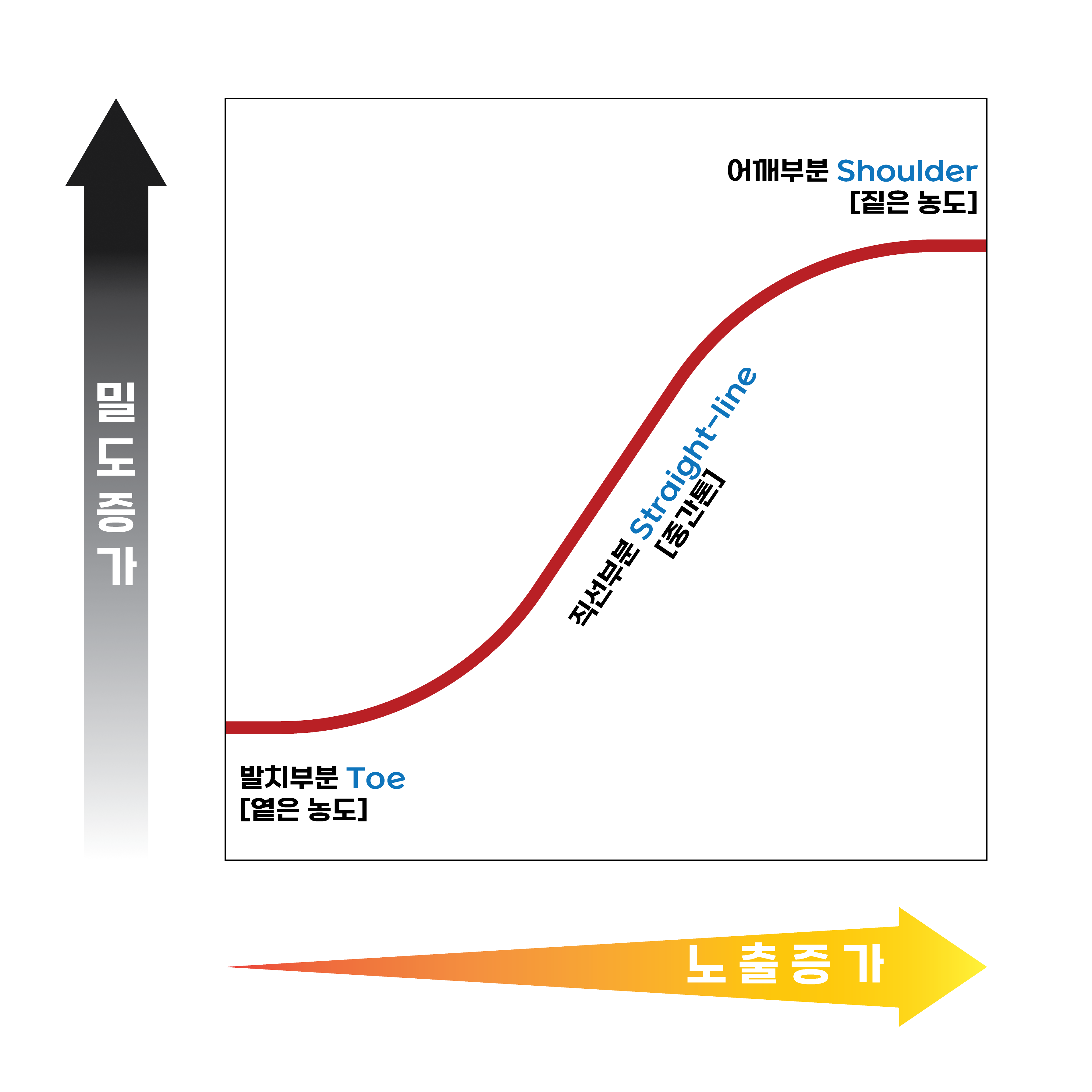 광량이 할로겐화 은을 반응시키기에 충분하지 않은 단계로 밀도가 거의 변하지 않으며 사진상에서는 암부(Shadow)의 디테일이 사라지고 단조로운 검은색으로 나타난다. 이를 `데이터가 쌓이지 않았다`고 표현한다. - 직선(Straight-line) 영역: 적정 노출(Normal exposure)